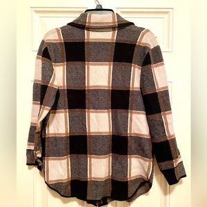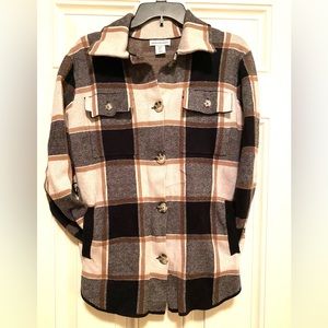 This jacket has hand pockets! More flexible and lighter weight than a normal Shacket. Black, brown & cream colored plaid. It is missing the belt/tie that came with it originally