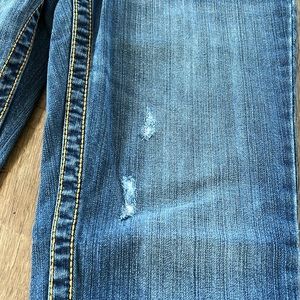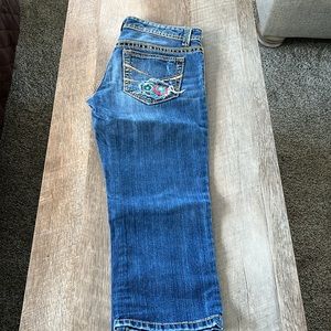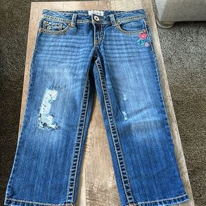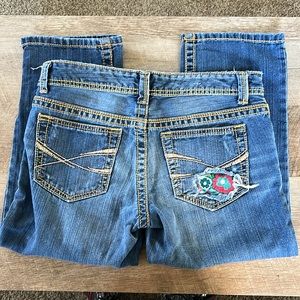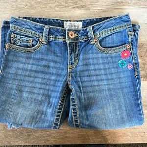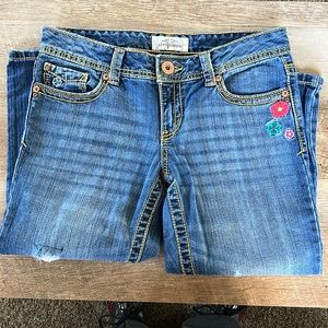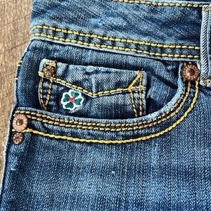 Crocheted flowers on back right pocket, small flower on coin pocket right front, left front hip area another set of flowers. 🌺 🌸