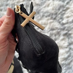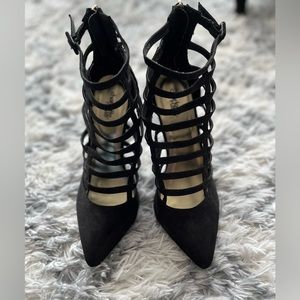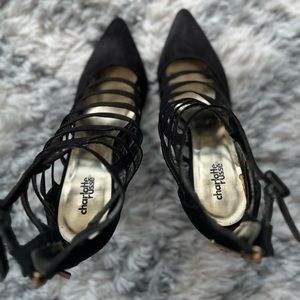 Charlotte Russe high heels, black, size 9, gladiator style wrap design, pointed toe, zipper at heel with cross design, one mark on inside of one shoe (see photo)