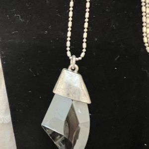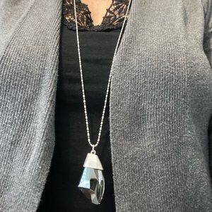 Chico’s long silver necklace with mirror like stone.