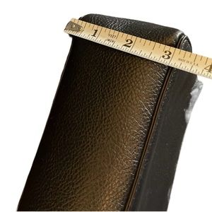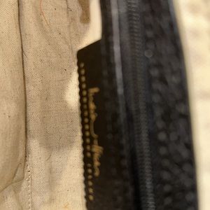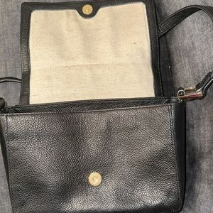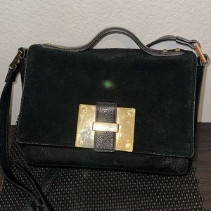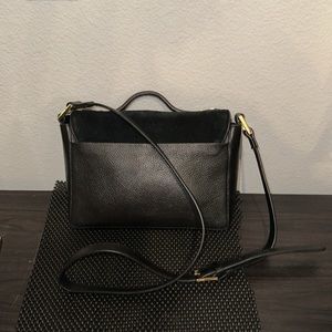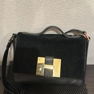 Luxurious in fine suede and pebbled leather, this top handle crossbody is incredibly "right-sized" and versatile. With its elegant gold accents, you could easily pair it with any formal evening look, but it's understated size allows you enjoy its luxury every day. Easy-open but secure magnetized suede flap closure. Convenient rear full-length slip pocket can hold your phone, sunglasses, anything you want ready-at-hand. Secure inner zippered pocket. Two side wall slip pockets if you prefer your items stowed away. Natural colored textile lining. L 10” x H 7” x W 3” Attached crossbody strap adjusts from 19.5" - 22.5" Excellent condition.
