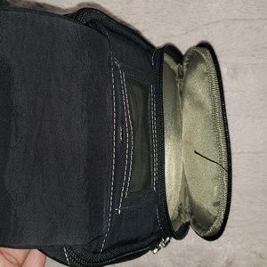 This is a black nylon bag by Baggalini. This bag does NOT include a strap. I use it with interchangable guitar straps like the one shown just for an idea. Baggalini is known for smart purses with tons of pockets and organization. This has 5 zippered areas, an ID window and flip up flap. Inside has 6 credit card slots, a hook and a small phone pouch. The back has an open pocket, great for a phone. The nylon shows no wear.