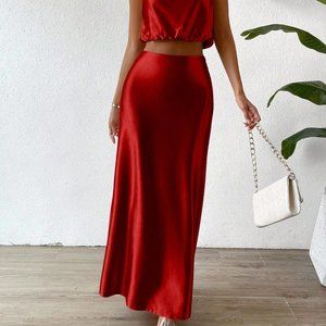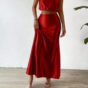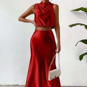 Red Preppy Womens Pile Heap Collar Crop Tank Top & Skirt