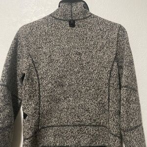 EUC with no flaws. Really Nice Zip up. Marled black and grey color. Black trim detail all around this piece. .There are 2 front pockets. Zipper and snap closure at bottom. Neck has a Button closure to keep you warm and toasty. This is such a great brand and their items are high quality. Flat lay measurements are as follows and are approximate.