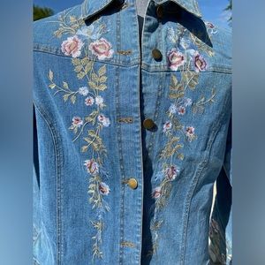 Bought so I could wear someplace special. Never wore, tags still attached. I bought at Macys and may be vintage or almost vintage. It is so stylish and not your regular denim jacket. The flowers are embroidered not pressed on. The tags say natural dyes used. It is a stunner.