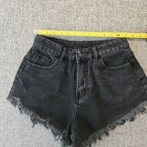 Upgrade your wardrobe with these stylish Shein Black High Waist Jean Cut Off Fray Shorts with Flame Embroidered Pockets. These shorts are perfect for a casual occasion and are made of a comfortable and durable cotton blend fabric. The shorts have a flat front and a zip closure, with a waist size of 27 inches and a rise of high (greater than 10.5 inches). The 5-pocket design provides ample storage space, while the pinch point and pockets features add a touch of elegance. The shorts come in a solid pattern, with dark fabric wash, and a beautiful black denim fabric type. The cut-off style and the rock theme of the shorts make them a perfect fit for juniors and women of all ages. The shorts are machine washable and can be worn in all seasons, making them a versatile addition to your wardrobe.