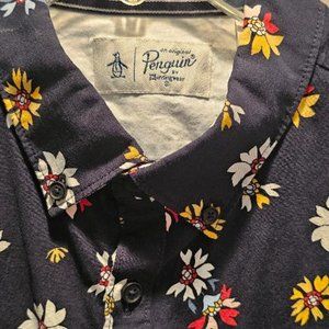 An Original PENGUIN short sleeve shirt. Navy blue with multi-color floral print. Breast pocket. Size XL. 60% cotton / 37% viscose / 3% elastane (which gives it a nice, comfortable stretch). Great shirt for both casual and dress occasions. Button down collar.