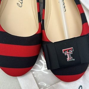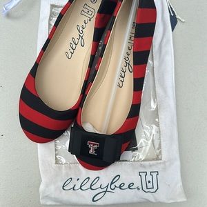 Brand new never been worn Lilly Bee red and black striped shoes with removable Texas Tech bow