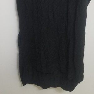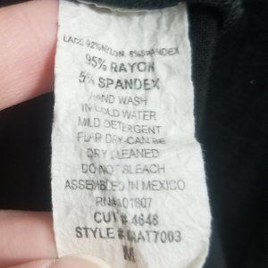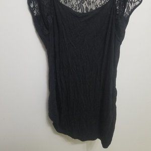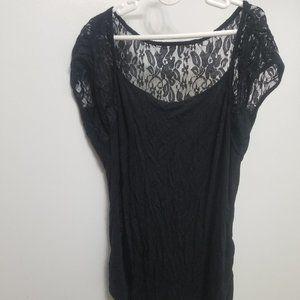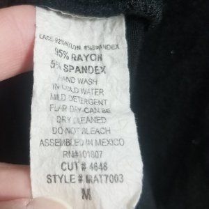 Unbranded (that tag is gone) black lacy women's Medium top. Front is mostly a black fabric with lace sleeves, while back is beautiful floral lace across the top of the fabric. The back is a couple inches shorter than the front. Lace is 92% nylon, 8% spandex; and main fabric is 95% rayon, 5% spandex. Light wear, but very good condition.