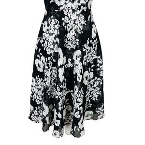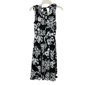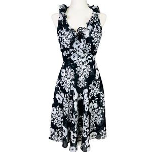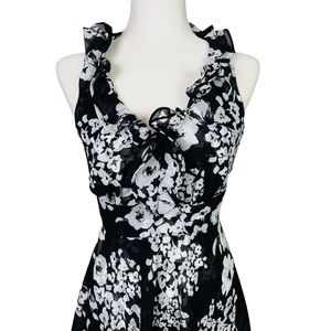 WHBM sleeveless black and white floral print fit and flare ruffled dress. Sleeveless fit and flare dress with a white floral print on a black background with a sheer layer over a satin underlining both in the same print. It has a v neckline with ruffling, an empire waist, a back hidden zipper and a tie that creates a keyhole opening. Measurements are bust 16 1/2” waist 13” length 40”. This item is preowned and in great condition.