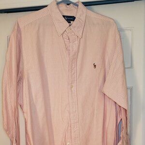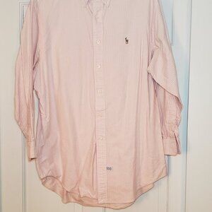 Excellent condition men's long sleeve Ralph Lauren button down shirt. Light pink/white stripes. Size 17.5" neck, 33" arm length. Equates to an XL size shirt. From a no pet, smoke free home.