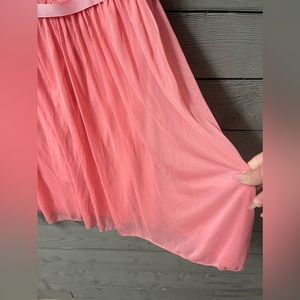 My daughter only wore this dress once, so it is in excellent condition. This dress is from David’s Bridal & is size 14 (womans). It’s a beautiful shade of coral/peach.