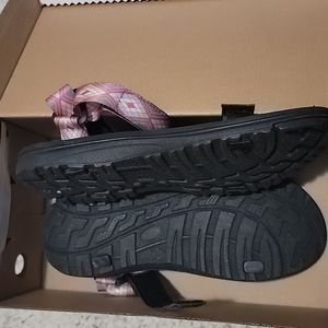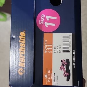 Northside Seaview sport sandals. Size 11. New in box. Gray and Pink colorful print. Breathable textured nylon webbing with neoprene backing. Durable EVA with rubber outsole ensures reliable traction and shock absorbency. Adjustable 2 strap system for custom fit. Sporty open toe design. Water resistant and quick dry. Wear on wet and dry surfaces.