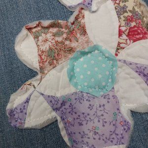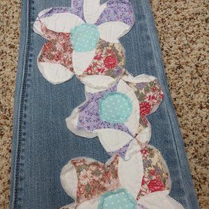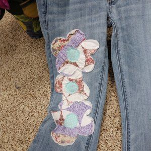 2959 Size 4 American Eagle Quilted Appliqued Flare Leg Jeans. Waist 15" inseam 31.5" rise 7".
