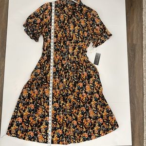 NWT Sharagano New York black, orange, navy and yellow floral dress! Ruffled sleeves. Gorgeous gold buttons. Pretty! Tie belt waist.