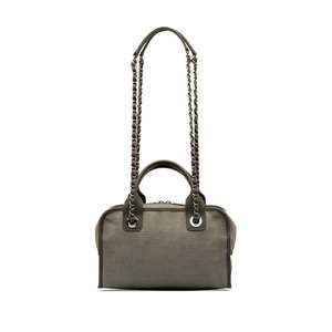 This satchel features a canvas body, flat leather handles, a leather woven chain strap with leather guard, a top zip closure, and an interior zip pocket.