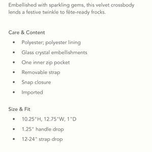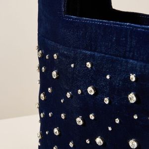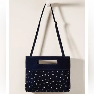 NWT Anthropologie velvet purse. Navy blue with rhinestones on both sides. Inside zip pocket. Strap included to be worn as a crossbody or over the shoulder. This is a stunner.