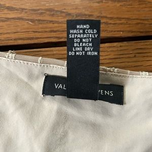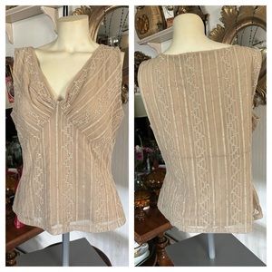 Exquisite and sexy plunging V-Neck Tan Lace & Sequin Sleeveless Top by VALERIE STEVENS ~ accentuating empire waistline ~ Size L ~ can be dressed up or down! Measured flat: 19” p-p; 17” across waist; 22-1/2” length from shoulder to bottom hem. In excellent condition with no issues. Smoke-free home. Available cream and brown as well.