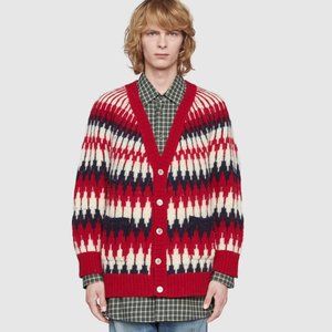GUCCI MENS SWEATER ZIGZAG JACQUARD THICK WOOL KNITTED CARDIGAN sz M Medium