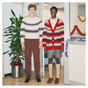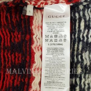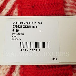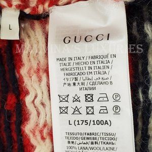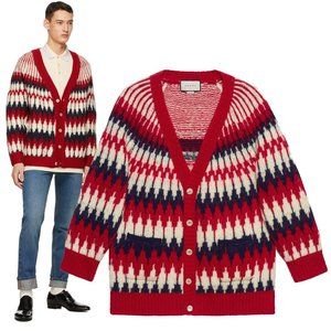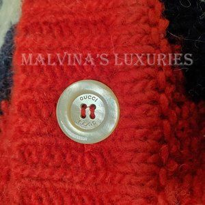 Unique Features: Crafted from red blue and ivory knit thick heavy wool, this Gucci cardigan features a zigzag motif for a retro feel. Mother of Pearl buttons. Patch Pockets. Rib Trims.