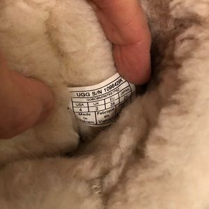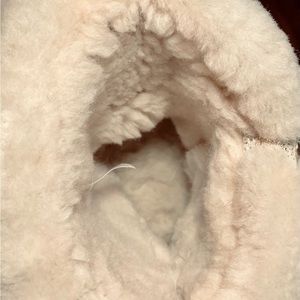 UGG boots, excellent used condition beautiful cream colored sheepskin with gold glitter, only worn a few times. Kids size 4 or fit’s ladies size 5.5 to 6. As you can see on the bottom, they have barely been worn. There’s one tiny little spot near the soul on the side of one boot, See the last photo, other than that they are in like new condition.