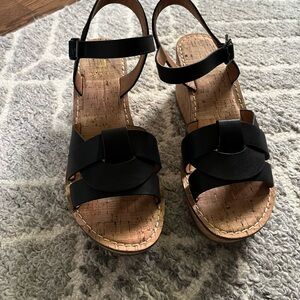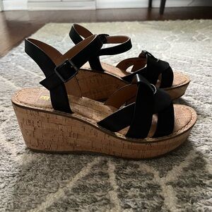 These have been worn once or twice. Cute cork wedge very versatile sandal.