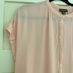 Fitted and flared, gold foil floral pattern. Gold zipper front, pockets, lined on top. 100% linen. 31” from neckline to hem.
