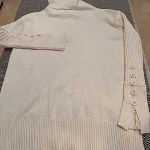 Ribbed down the arms and hem. Super cut button details down the wrists ending in little slits. See pics for details in the sweater.
