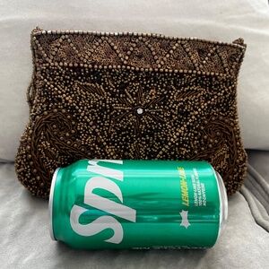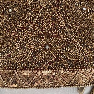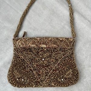 Beautifully beaded hand purse in gold tones. Silk red interior. Very good condition- used only a couple of times.