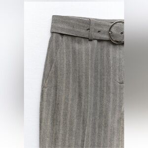 High-waisted pants with belt loops. Side pockets and false back welt pocket. Straight leg with vents at hem. Self-belt with metal buckle. Front zip, metal hook, and interior button closure.