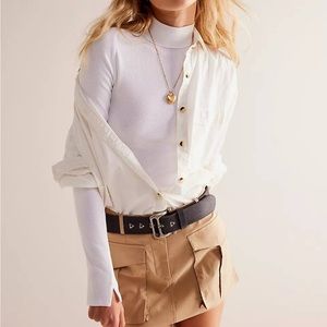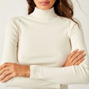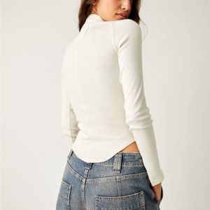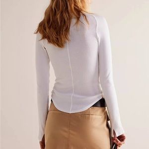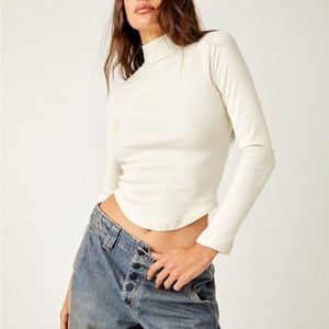 This top by We The Free from Free People features a mock neckline, defined seaming, rounded bottom hem, fitted design, and ribbed knit fabrication.