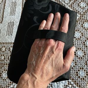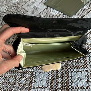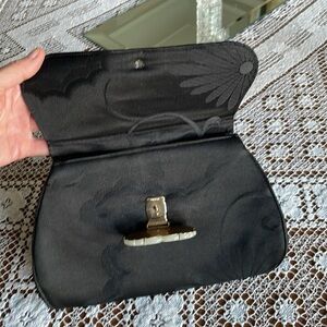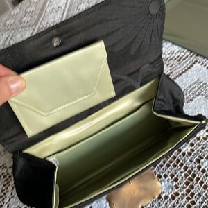 Hand sewn, fashioned from exquisite silk brocade used in the wide kimono sashes (Obis) worn by Japanese women. Outside is black fabric, inside is light green. Includes card holder. Clutch