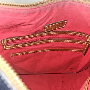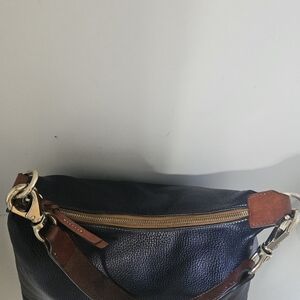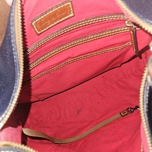 Dooney and bourke Blue navy Pebbled Leather Tote Bag ,top Zipper closure, interior Zipper pocket, distressed brass hardware, leather tan handle.