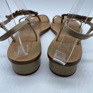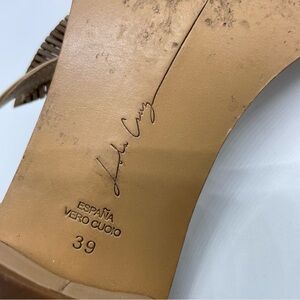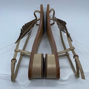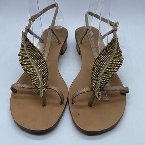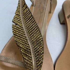Lola Cruz Rhinestone Feather Sandal. Flat strappy gold sandal with thin feather/leaf over foot. A few of the rhinestone leather strips have separated. Size 39 equals 8-8.5