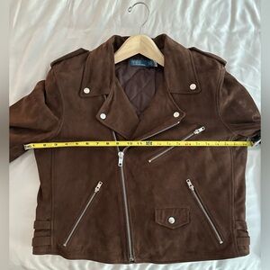 Original listing: A luxe addition to Polo’s moto-inspired offering, this jacket is rendered in soft, sueded leather with nickel-tone metal hardware.