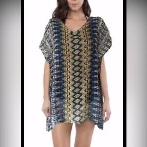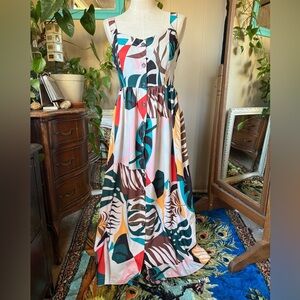 Cute colorful mixed animal print sleeveless dress with deep V in front and back and a wide smocked waist. Fabric is very soft and stretchy. Excellent like new condition with tag attached. From a nonsmoking pet friendly home.
