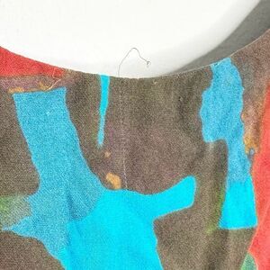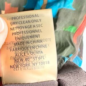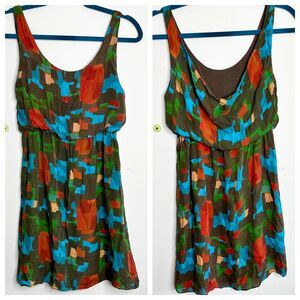 Alice + Olivia Multicolor Short Dress, Size XS/S. 100% Silk Brown with blue red gold green pattern. In good preowned condition, small subtle runs across areas of dress. Very hard to see, unless specifically looking for flaws. See pics. Priced accordingly. Artsy vintage geometric, kind of MCM. Tank style top, back lower than front. Straight skirt bottom with cinched waist. Top blouses over skirt at waist. Pretty feminine shape with warm spring bold pattern. Fully lined, pull on.