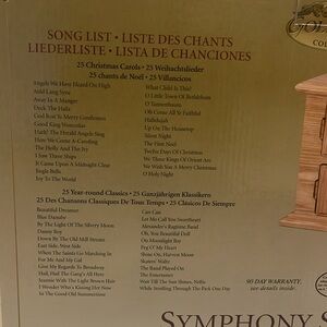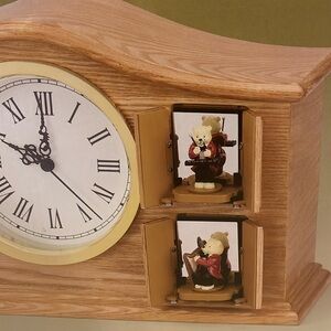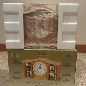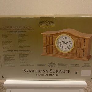 Mr. Christmas Gold Label Symphony Surprise band of bears musical action clock. Brand new in box never used. Elegant clock in wooden box. Doors synchronize open and close. Four animated musical bears move in and out. Plays 50 songs: 25 Christmas carols & 25 year around classics. Antique collectible.