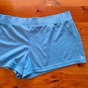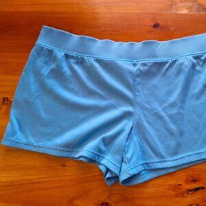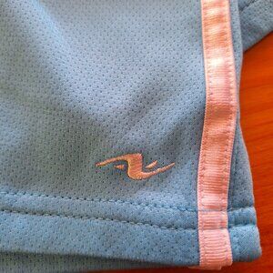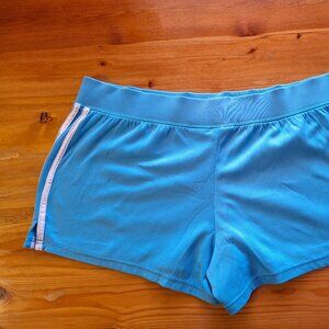 Pretty light blue color with thin white strips down the sides, elastic waist, and dri-weave type material. Approx measurements: length 12.5", waist 20.2", hip 24.75", inseam 3", rise 13". Pet friendly home but kept in spare room tub. Wood background is dining table, not the floor.
