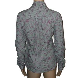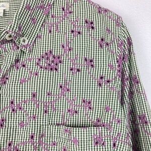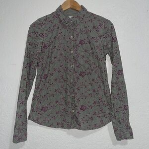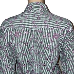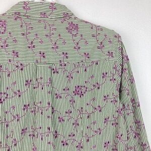 EUC with no flaws. Super cute button down shirt. olive green and white small checkered pattern with purple floral embroidery on top. See pics for more detail. Size 6 .