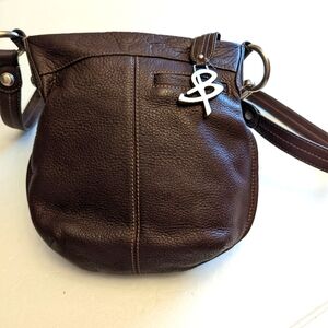 Chocolate brown leather B. Makowsky crossbody bag. Approximately 44 inch strap. 11 L 10 1/2 W Pocket and buckle detail on the front. Animal print interior with a zipper pocket and several other ones.