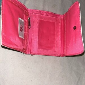 Justice Wallet with Black and white stripes at the back and inside is all pink with Coins compartment and money holder. Wallet comes with a pom pom but it’s a little dirty! No worries it can be easily cleaned❤️