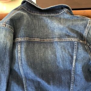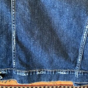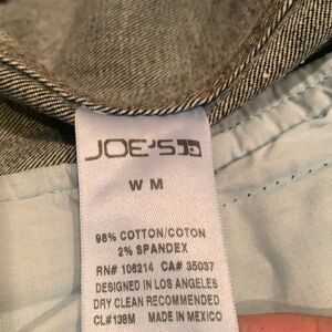 Joe Jean Distressed Jean Jacket Denim Dark Blue Brass Button Sz M. Great condition soft denim not sure if it’s a Woman’s or Mans but it fits nice 19” Pit to Pit, Arm length from shoulder Seam 24”. Length from top shoulder seam to bottom of jacket 24”. Any questions please send me a message. 98% cotton 2% cotton
