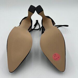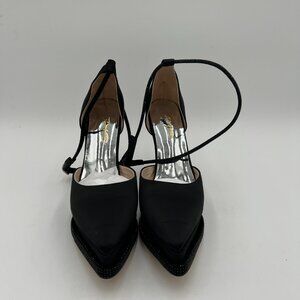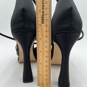 XYD Black Pointed Toe Platforms Crystal Ankle Wrap Strappy Block Heel Satin Shoe