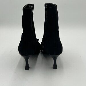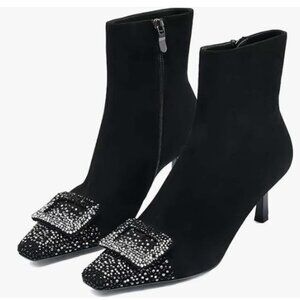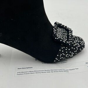 XYD Black Bling Rhinestones Buckle Mid Heel Ankle Bootie Square Toe Fashion French Short Skinny Boots Side Zip Dress Party Shoes