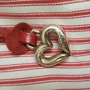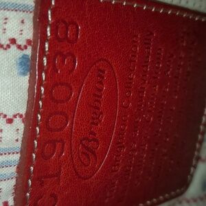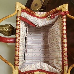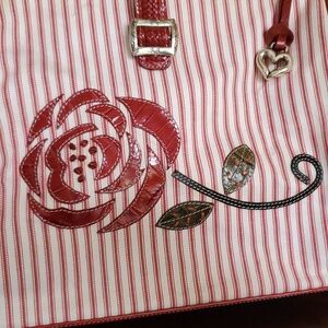 Description: This super-cute Vintage style bag features a red leather rose and red leather bottom with red heart feet. Has bamboo handles and a charm strap w/heart stamped "Brighton". This Extra-Large tote is perfect for multiple occasions. It's rad for shopping, a vacation w/ lots of shopping, carry on, weekend sack, etc. Or, would make an excellent day bag for the bold fashionista. Bag has a magnetic closure and silver hardware accents. The interior is lined with cotton linen fabric in a retro print, and features a key charm.
