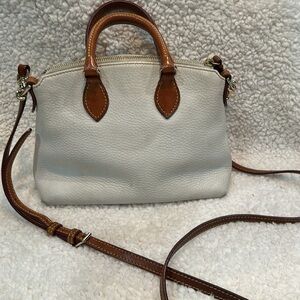 Dooney and Bourke crossbody leather cream with tan handles with long strap corners have small marks and mark on front of bag bottom has some marks inside has 2 pockets on right side with zipper compartment left side has 2 pockets key holder on inside has lots life left