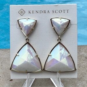 The image shows a pair of Kendra Scott Danielle earrings in dichroic glass. These earrings feature an oval-shaped dichroic glass stone set in a metal frame, suspended from a hook. Dichroic glass is known for its iridescent, color-shifting properties, which means the earrings display a variety of colors depending on the angle of light and the viewer's perspective.