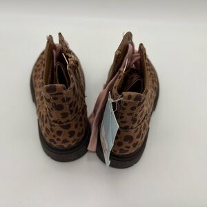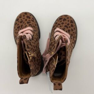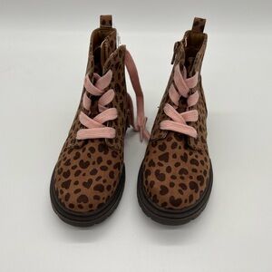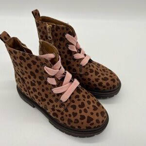 The Cat & Jack Toddler Girls' Amaya Zipper Lace-Up Combat Boots in Brown are perfect for casual wear and travel. The boots feature a heart leopard design and zipper accents. They have a round toe shape and a low heel height. The outsole is made of 55% polyester and 45% TPR, while the upper material is 100% polyester. The boots have a zipper and lace-up closure, making them easy to put on and take off. They are available in select sizes for US, AU, UK, and EU shoe sizes.