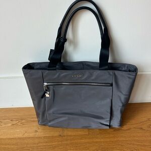 Beautiful muted tones of blue,cream and taupe w a leather pull string at the waist. Very elegant and perfect to wear at a spring or summer event or even for a wedding! Quite elegant. Worn once for an hour